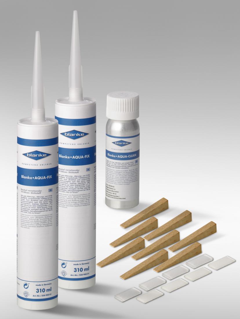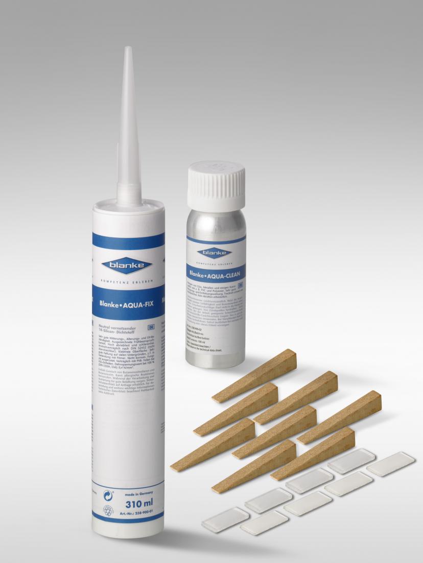 BLANKE AQUA-GLAS KIT ist ein komplettes Montageset zum Einsetzen einer ESG-Glasscheibe in eine oder mehrere BLANKE AQUA Profile.